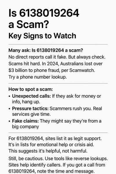Many ask: Is 6138019264 a scam? No direct reports call it fake. But always check. Scams hit hard. In 2024, Australians lost over $3 billion to phone fraud, per Scamwatch.Try a phone number lookup.