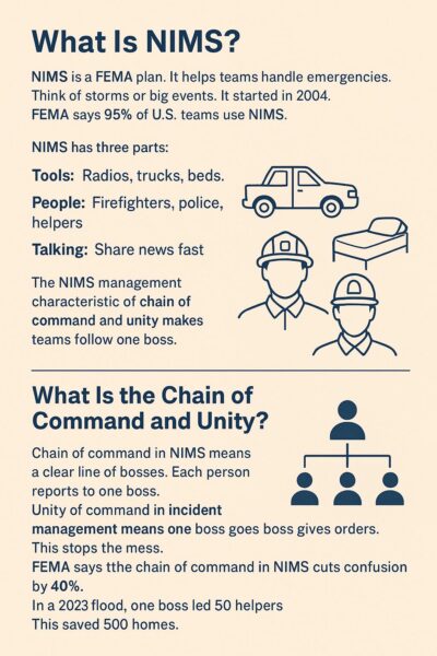 Chain of command in NIMS means a clear line of bosses. Each person reports to one boss. Unity of command in incident management means one boss gives orders. This stops the mess. FEMA says the chain of command in NIMS cuts confusion by 40%. In a 2023 flood, one boss led 50 helpers. This saved 500 homes.
